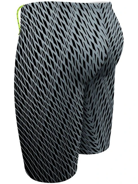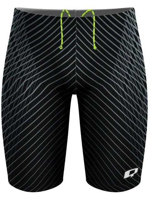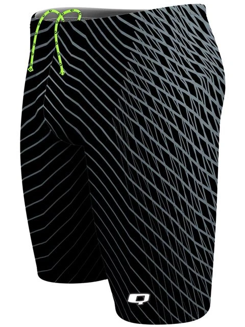 The Q Swimwear Jammers – Rapid have a sleek black and grey geometric print. The jammers have a bright drawstring waistcord and a Q Swimwear logo printed on the lower front leg.