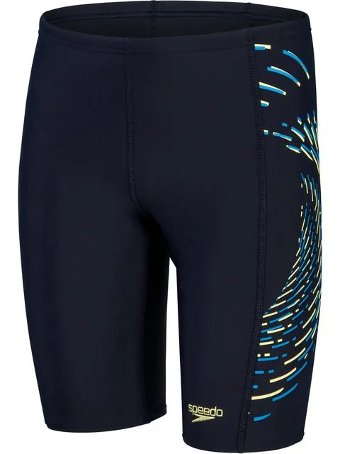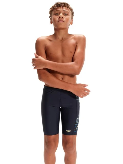 The Speedo Jammers – Navy/Bondi Blue/Spritz is everything your child needs for a great swim. Featuring a red and grey ‘cresting wave’ plastisol graphic, this sleek-looking black Jammer is stylish and understated. Ideal for training, lessons and fun in the pool, it’s lined at the front for comfort and modesty and includes an internal drawcord to allow young swimmers to adjust the fit. Providing higher chlorine resistance than standard swimwear fabrics, the jammer offers excellent shape retention and fits like new for longer with CREORA® HighCloâ„¢. If you’re looking for great eco-credentials, it’s got those, too: the exclusive Eco EnduraFlex fabric is made from 100% recycled pre-consumer waste, such as fabric waste from factories.