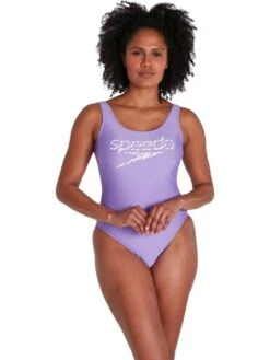 The Speedo Logo Deep U-Back One Piece – Miami Lilac will have you walking on the wild side with exotic colours and prints. Whether you’re lounging or lane swimming, this stunning lilac Deep U-back swimsuit with contrasting animal print Speedo logo brings a touch of style to the pool and beach. The scoop neck, deep U back and high cut leg provide an on-trend fit, while the ECO Endurance 10  fabric provides superb colour performance. Offering higher chlorine resistance than standard swimwear fabrics, it fits like new for longer with CREORA® HighCloâ„¢ and has been made from 100% recycled materials.