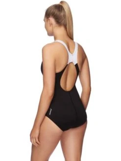 The Speedo Splice One Piece – Black/White features a versatile v-neck with shelf bra and supportive key holeis solid black with contrasting white coloured panelling down each side of the swimsuit and white spliced through the straps. There is a large black plastisol placement Speedo logo down one side panel of the swimsuit. The embroidered Speedo logo sits in the middle of the chest and the Endurance+ logo is on the back.