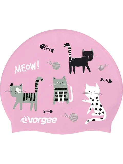 The Vorgee Junior Character Swim Cap – Cats features friendly black, white and silver cats, balls of yarn and fish bones on a pastel pink base.